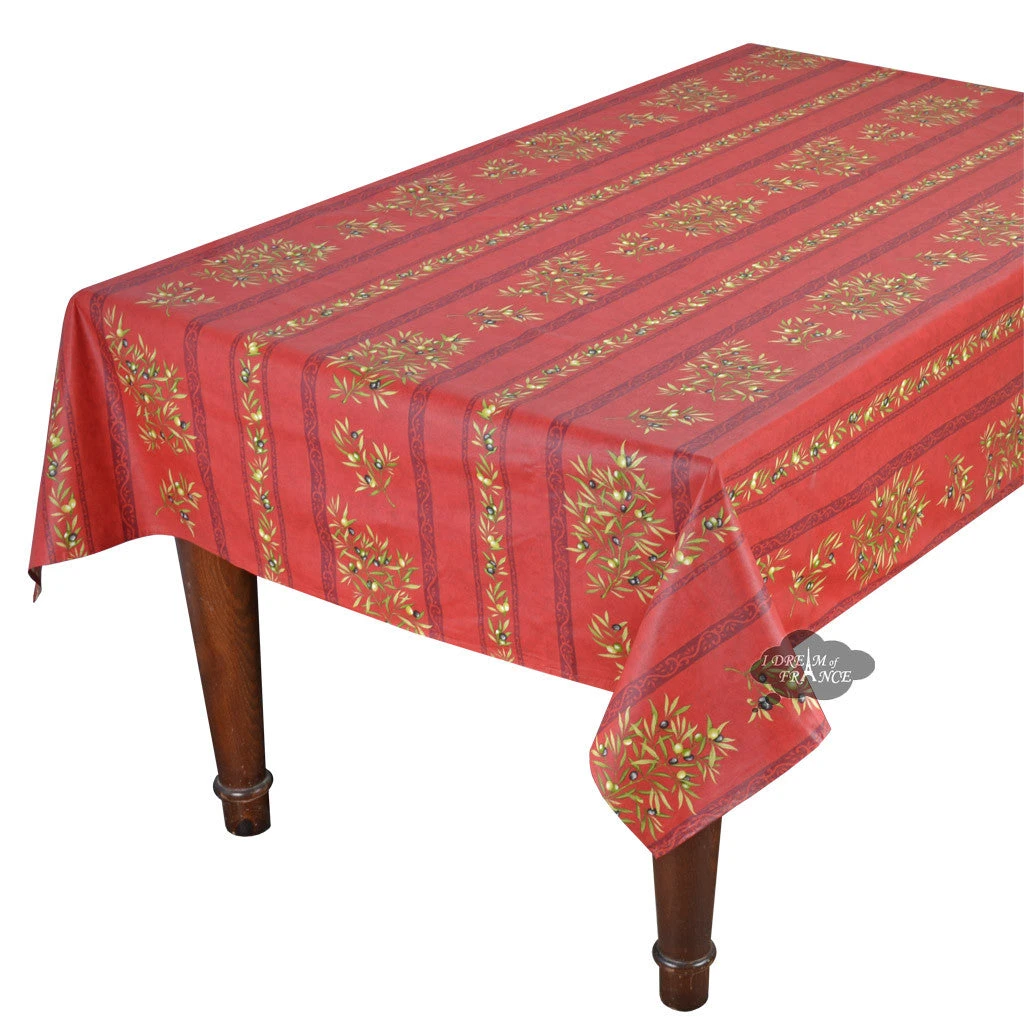 From Provence, this coated tablecloth features bright and cheerful olive branches on a red background. It is 100% cotton coated with acrylic to make it stain resistant and long lasting. Spills will not go through, protecting your table. Cleanup is as easy as wiping it with a sponge. UV resistant, they resist fading and are perfect inside or outside.