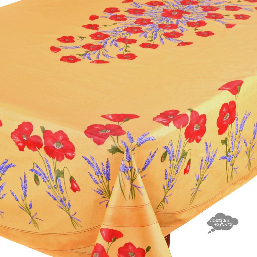 From Tissus Toselli, this coated tablecloth features bright and cheerful poppy and lavender motifs on a golden yellow background. It is 100% cotton coated with acrylic to make it stain resistant and long lasting. Spills will not go through, protecting your table. Cleanup is as easy as wiping it with a sponge. UV resistant, they resist fading and are perfect inside or outside.
