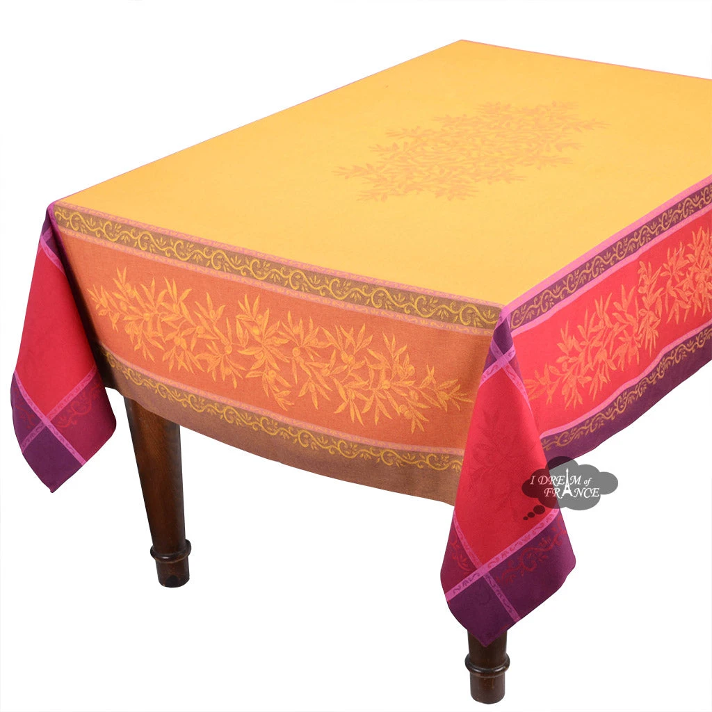The Olive jacquard table linens capture the color and spirit of Provençal living. This tablecloth is yarn-dyed and damask-woven for beauty and durability. It is treated with Teflon® to make it stain resistant and to protect your table. The beautiful Olive yellow design depicts olive branches on golden yellow, red and orange backgrounds with brown, pink, and purple accents.This 62×138″ rectangular tablecloth typically fits a table seating 10 to 12 people. 100% cotton – Teflon® treated. Washable. Made in France.