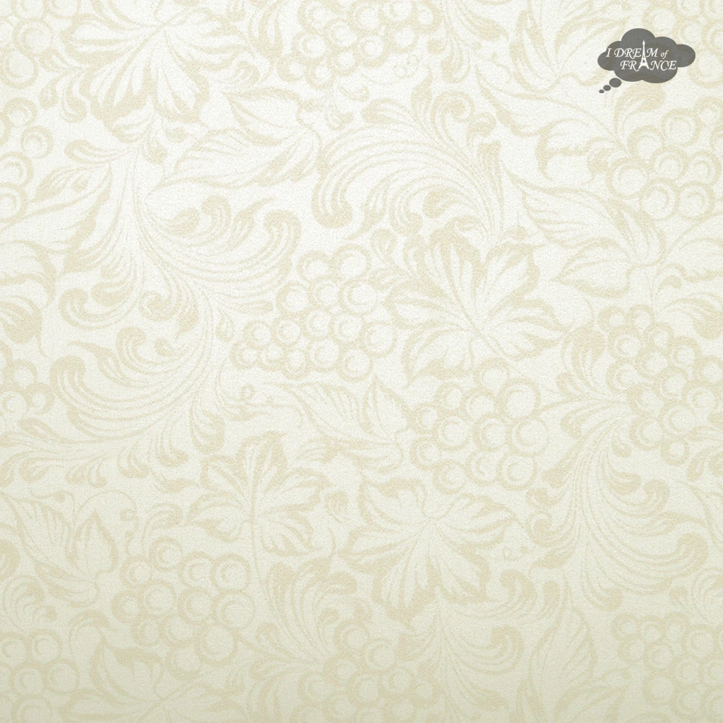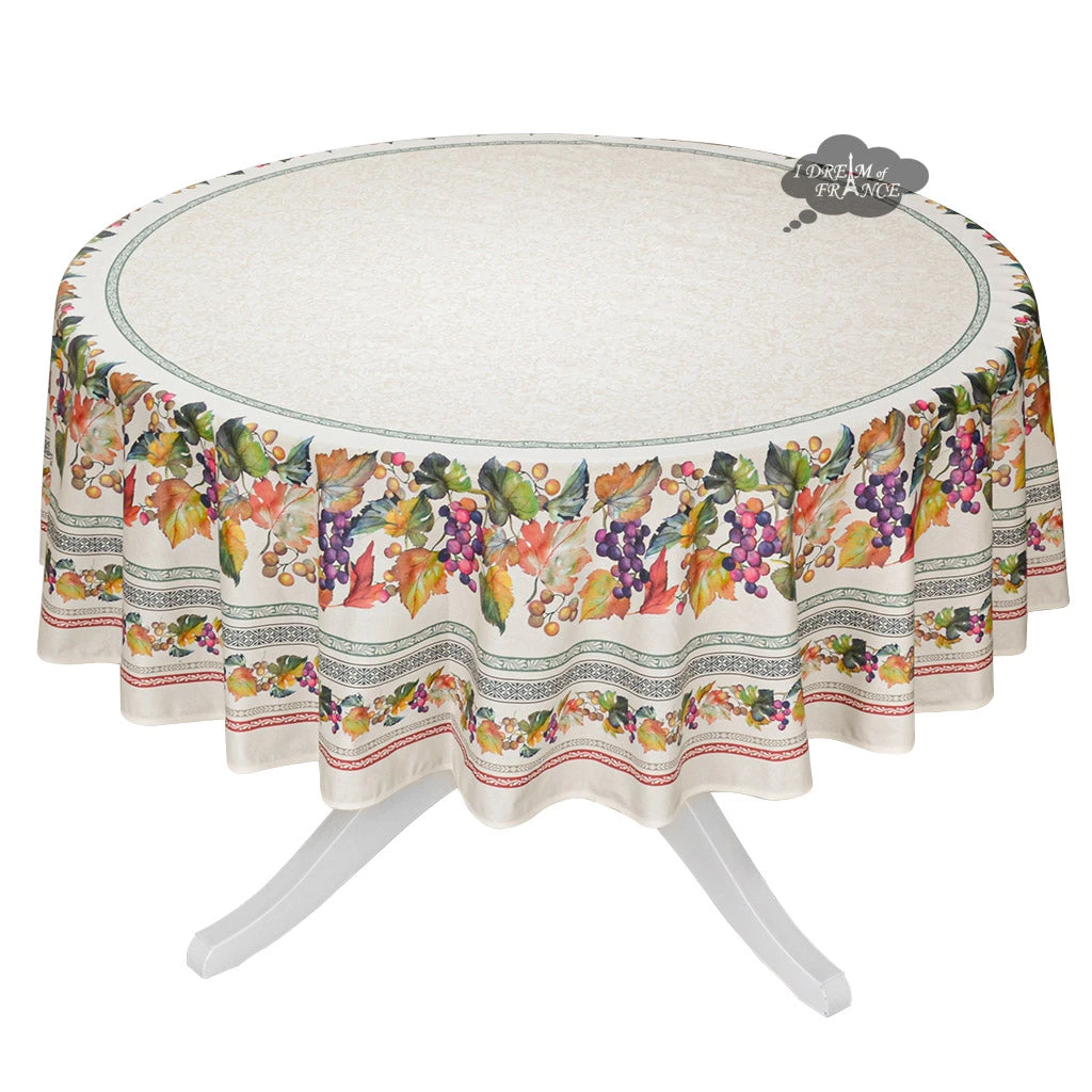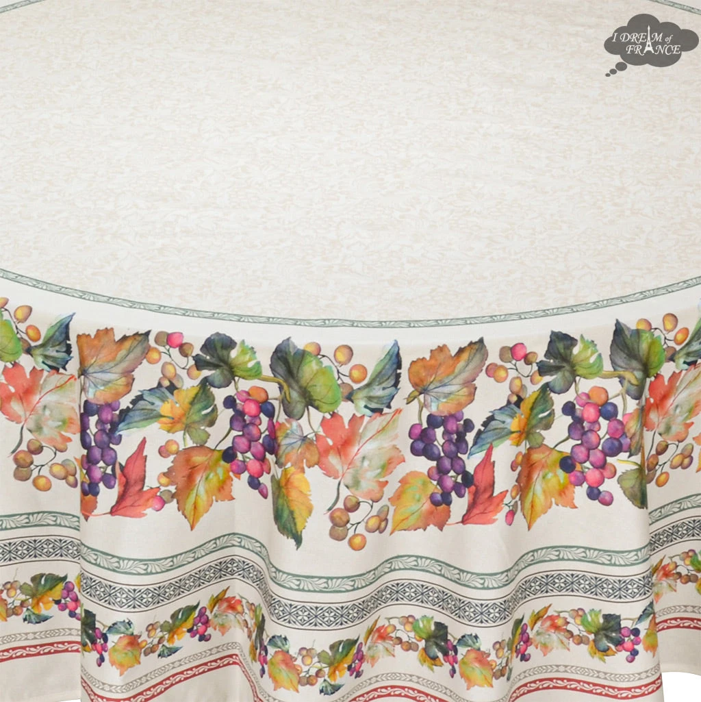 From Tissus Toselli, this coated tablecloth features colorful and cheerful Grapes motifs on a cream background. It is 100% cotton coated with acrylic to make it stain resistant and long lasting. Spills will not go through, protecting your table. Cleanup is as easy as wiping it with a sponge. UV resistant, they resist fading and are perfect inside or outside.