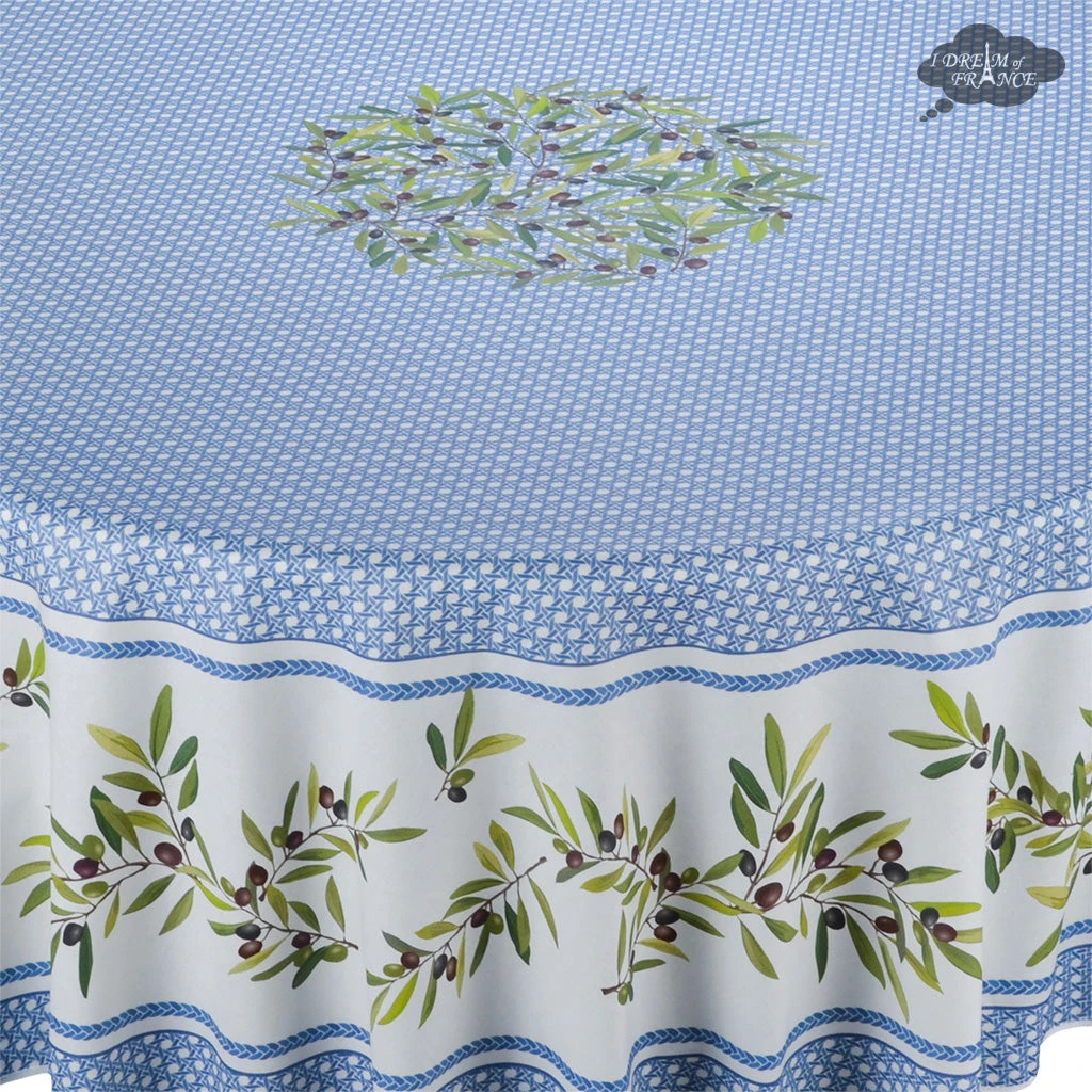 From Tissus Toselli, this coated tablecloth is named after the picturesque town of Nyons in the heart of Provence. It features a bright and cheerful olives motif on a blue and white background with a woven cane rattan pattern. It is 100% cotton coated with acrylic to make it stain resistant and long lasting. Spills will not go through, protecting your table. Cleanup is as easy as wiping it with a sponge. UV resistant, they resist fading and are perfect inside or outside.