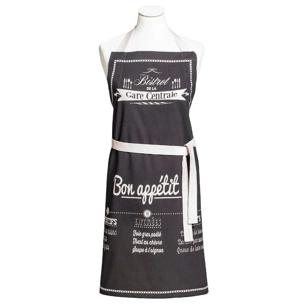 The Bon Appétit cotton apron from Coucke will brighten your kitchen and your day. This black apron features a French menu in white from the fictitious restaurant “Bistrot de la Gare Centrale”. Includes a white adjustable neck and tie.