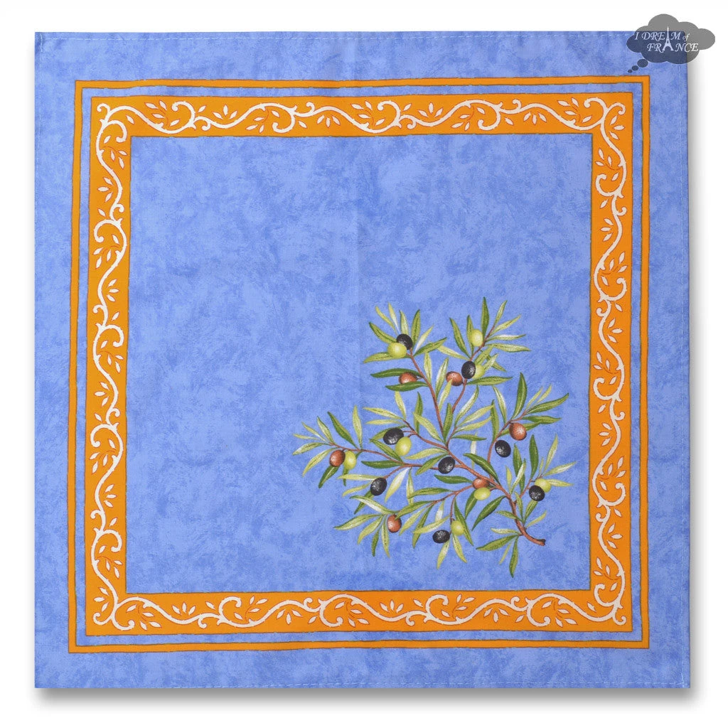 From Provence, these cotton napkins will complement our Clos des Oliviers blue line or just look great on their own. It features olives branches on a blue background. They are 100% cotton. Napkins are NOT coated. These napkins measure 15″ across. Sold individually. Made in France.