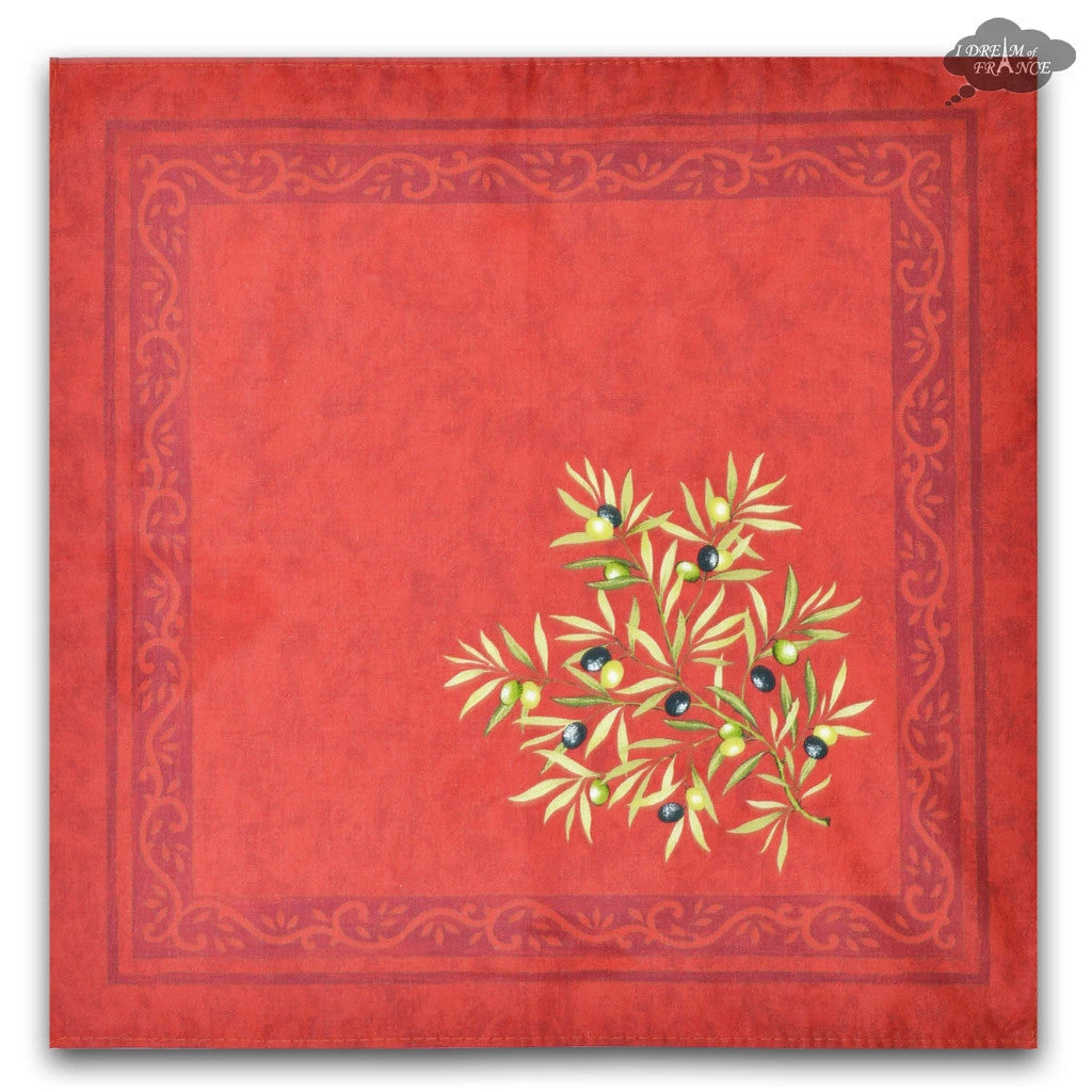 From Provence, these cotton napkins will complement our Clos des Oliviers red line or just look great on their own. It features olives branches on a red background. They are 100% cotton. Napkins are NOT coated. These napkins measure 15″ across. Sold individually. Made in France.