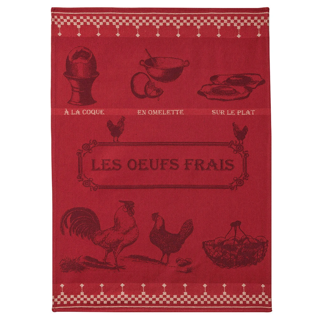 The Les Oeufs Frais (Fresh Eggs) jacquard dish towel from Coucke will brighten your kitchen and your day. This dark red towel measures 20″ x 30″ and features a detailed illustration woven into the towel of chickens, a basket of eggs as well as egg dishes such as A la Coque (boiled egg), En Omelette (omelet), and Sur le Plat (fried egg). Beautiful and soft, this towel will serve you well.