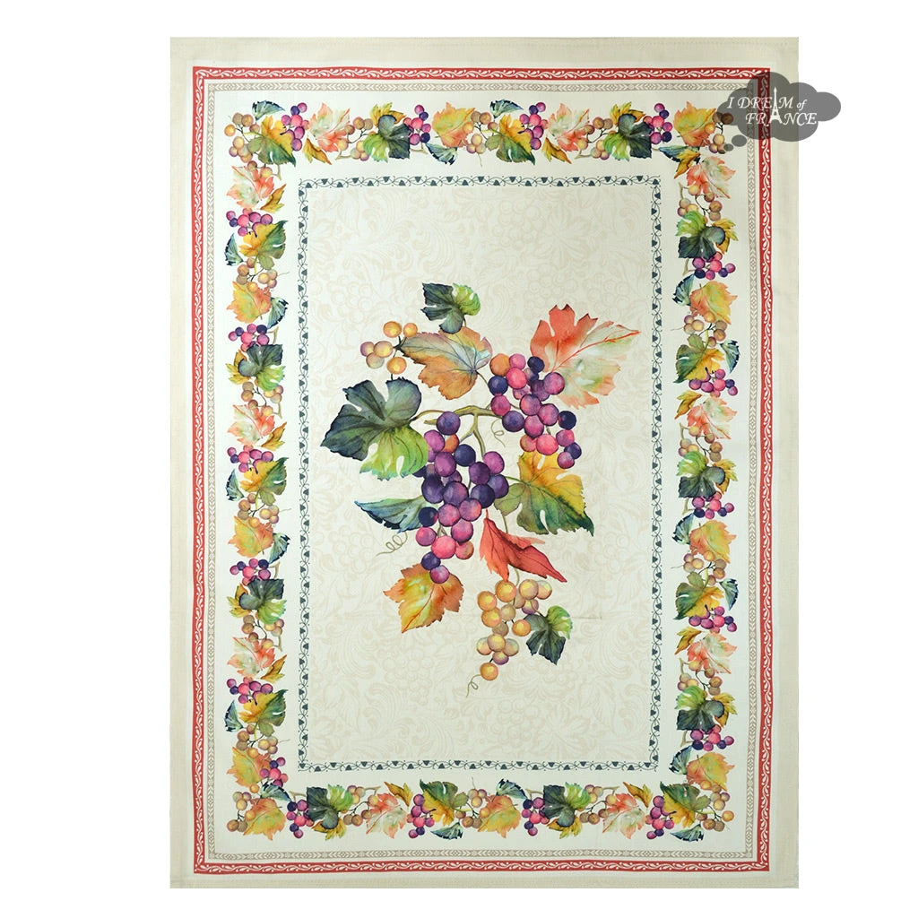 This soft and beautiful cotton kitchen towel is printed with a Grape theme on a cream background . The design coordinates with our Grapes line by Tissus Toselli. Measures 20×27″. 100% cotton. Made in France.
