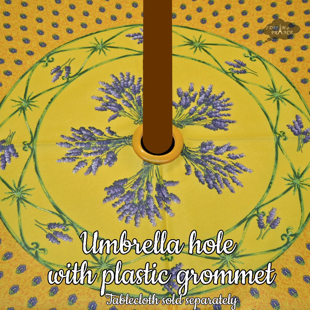 Option 2: The umbrella hole with plastic grommet. The umbrella hole is finished with a plastic ring. Most tablecloths will be done with a dark brown plastic ring. In some cases we will use a ring of coordinated color. This is done in-house and will not add any delay or cost. This option is only for a hole and requires the umbrella to be lifted off the table to change the tablecloth.