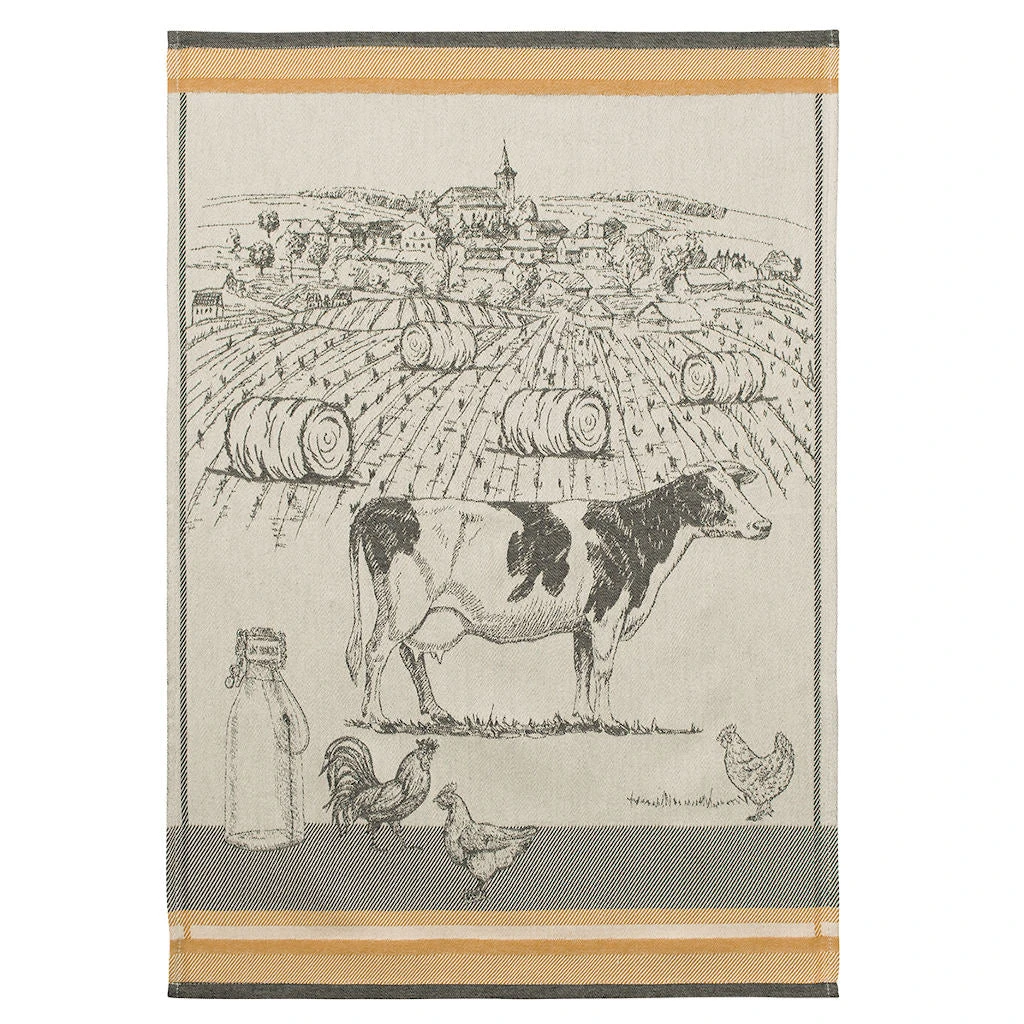 The Vaches Laitières (Dairy Cattle) jacquard dish towel from Coucke will brighten your kitchen and your day. This gray and ochre towel measures 20″ x 30″ and features a detailed illustration of a cow in a beautiful French country landscape. Beautiful and soft, this towel will serve you well.