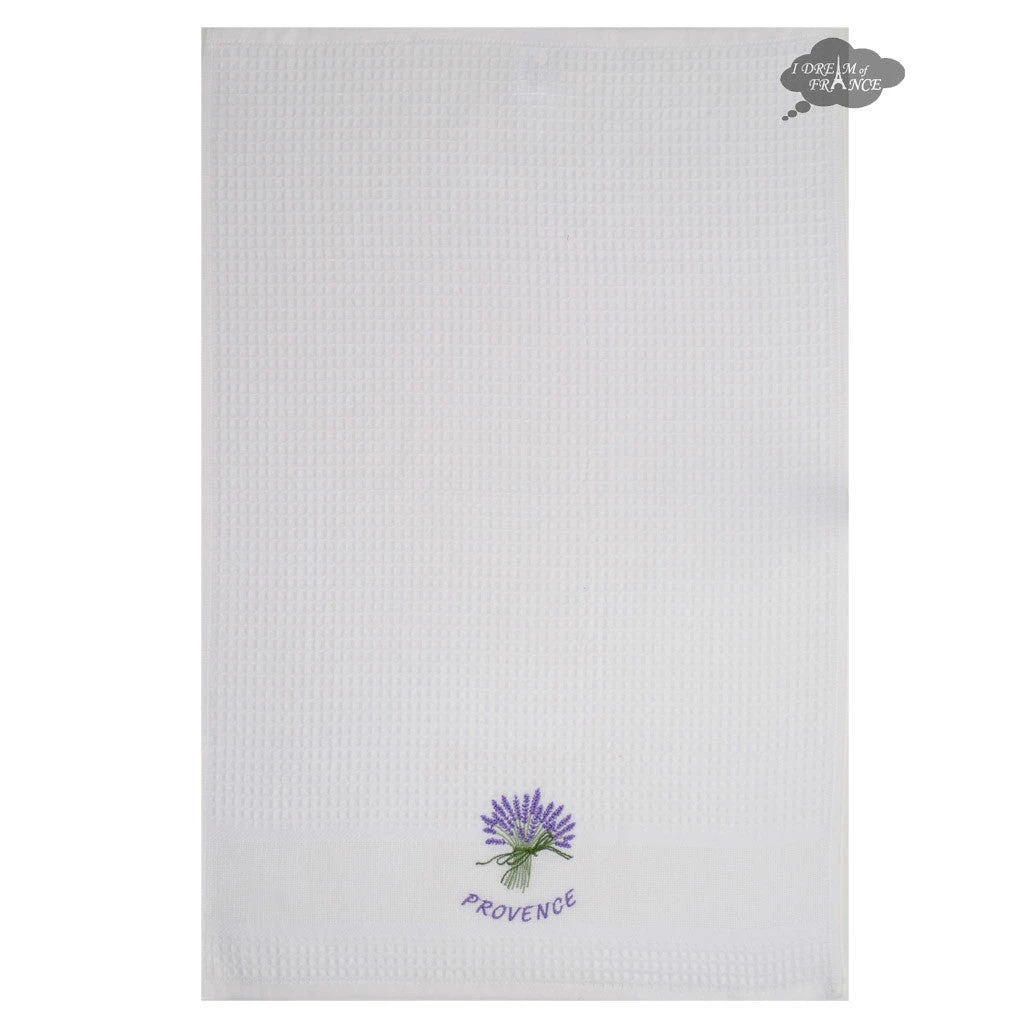 Direct from Provence, this beautiful towel will be a great addition to your kitchen. Made of 100% cotton, this towel will handle the toughest jobs thanks to its waffle-weave texture. This white towel is embroidered with a bouquet of lavender and the word Provence. It comes rolled as on the picture, perfect for offering as a gift.