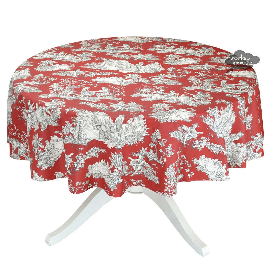 From Le Cluny French Country Collection, the Villandry Red is a traditional French toile design. It features French peasant scenes on a red background. It is 100% cotton coated with acrylic to make it stain resistant and long lasting. Spills will not go through, protecting your table. Cleanup is as easy as wiping it with a sponge. UV resistant, they will not fade and are perfect inside or outside.