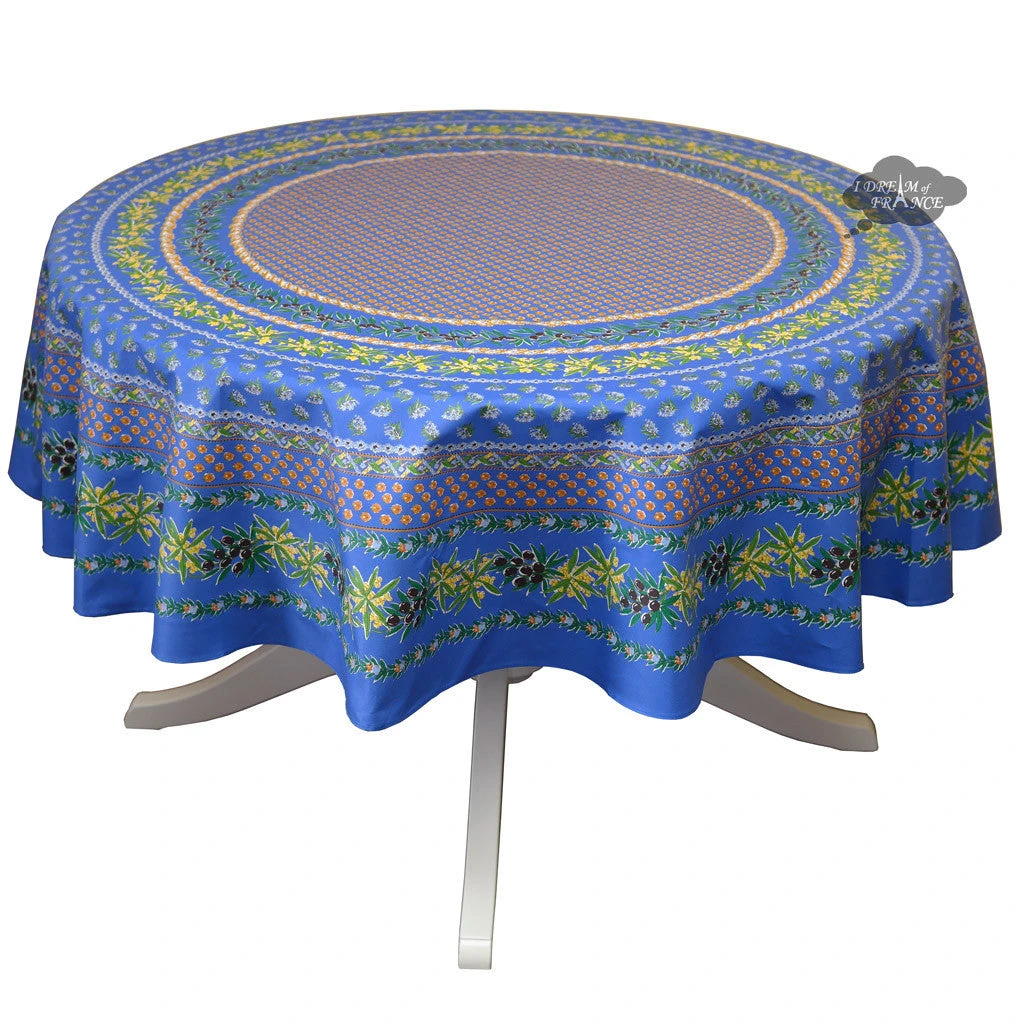 Enjoy summer all year round! From Le Cluny French Country Collection, this coated tablecloth will transport your table to sunny Provence. It features olives and mimosas on a blue background. It is 100% cotton and is available with or without stain resistant coating. With the acrylic coating, spills will not go through, protecting your table. Cleanup is as easy as wiping it with a sponge. UV resistant, they will not fade and are perfect inside or outside.
