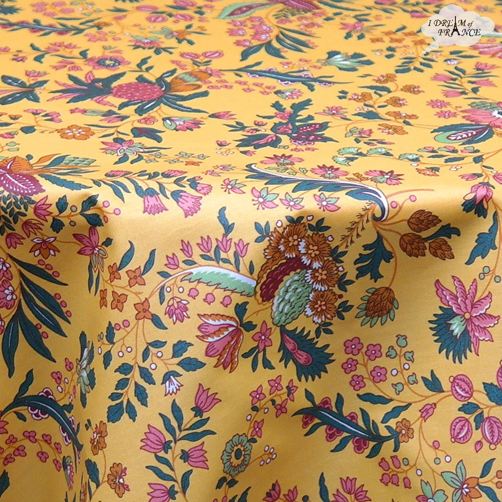 Enjoy summer all year round! From Le Cluny French Country Collection, the Versailles coated tablecloth is fit for royalty! It features an indiennes or jacobean pattern on a yellow mustard background. It is 100% cotton coated with acrylic to make it stain resistant and long lasting. Spills will not go through, protecting your table. Cleanup is as easy as wiping it with a sponge. UV resistant, they will not fade and are perfect inside or outside. This tablecloth measures 60″ in diameter, it will fit most round tables up to about 44 inches in diameter. Made in France. It can be ordered with an umbrella hole, please see below for options.