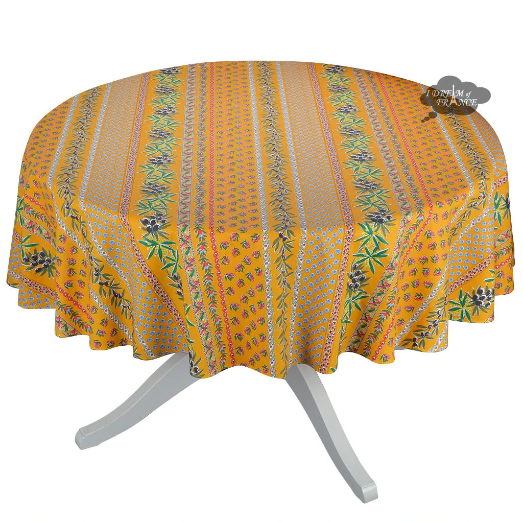 From Le Cluny French Country Collection, this coated tablecloth will transport your table to Provence. It features olives and mimosas on a mustard yellow background. It is 100% cotton coated with acrylic to make it stain resistant and long lasting. Spills will not go through, protecting your table. Cleanup is as easy as wiping it with a sponge. UV resistant, they will not fade and are perfect inside or outside. This tablecloth measures 70″ in diameter, it will fit most round tables up to about 52 inches in diameter. Made in France. It can be ordered with an umbrella hole, please see options below.