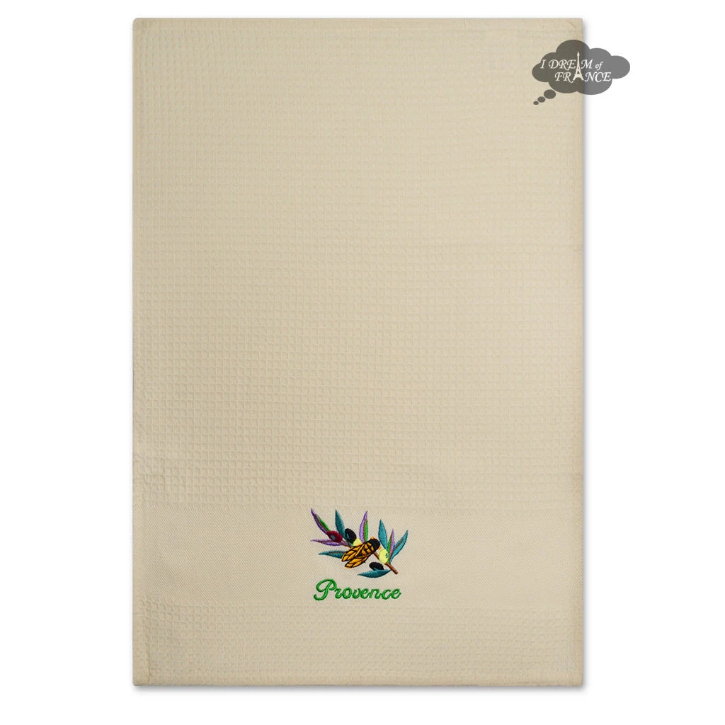 Direct from Provence, this beautiful towel will be a great addition to your kitchen. Made of 100% cotton, this towel will handle the toughest jobs thanks to its waffle-weave texture. This cream colored towel is embroidered with an olive branch, a cicada, and the word Provence at the bottom center. It comes rolled as on the picture, perfect for offering as a gift.