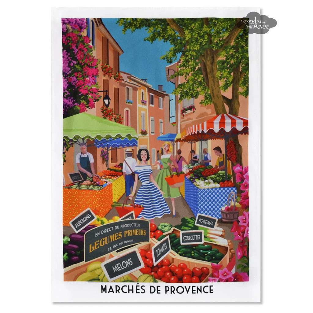 Step into Provence with this beautiful kitchen towel! It is printed with a typical scene at a French outdoor market (marché) in the South of France. The colors of the towel reflects the beauty of the sunny region. Details abound such as the signs with the names of vegetables and advertising the merchant. The artwork is printed digitally on 100% soft serge cotton. Measures 19×26″. Made in France.