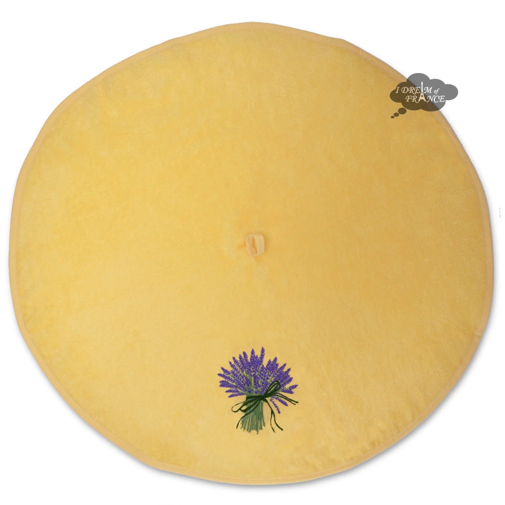 Direct from Provence, this hand towel is as beautiful as it is practical. In the kitchen or the bathroom, this round towel hangs from its center loop on the wall and offers a lot of surface area to dry your hands. This yellow terry towel is embroidered with a bouquet of lavender. Measures 29″ in diameter. Made in Turkey.
