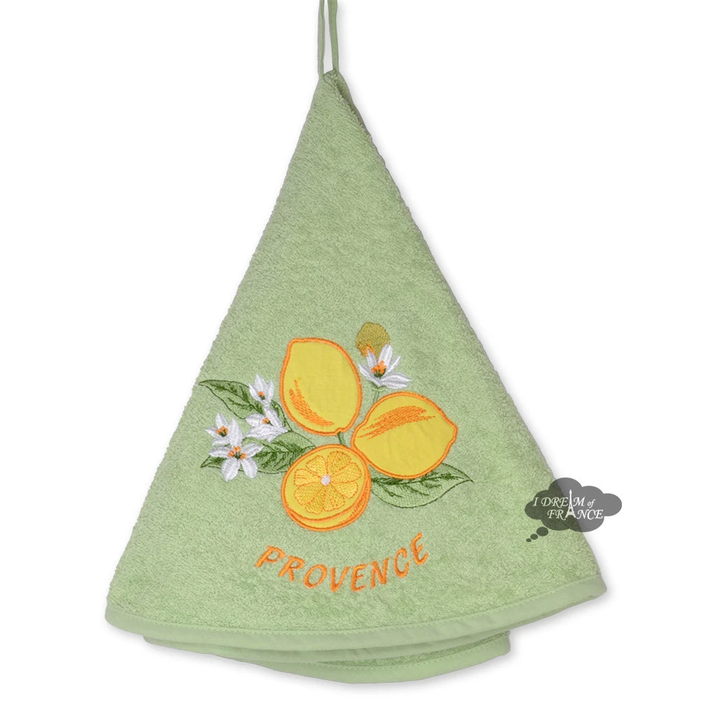 Direct from Provence, this hand towel is as beautiful as it is practical. In the kitchen or the bathroom, this round towel hangs on the wall and offers a lot of surface area to dry your hands. This green terry towel is embroidered with lemons and the word Provence. Measures 29″ in diameter. 100% cotton. Made in Turkey.