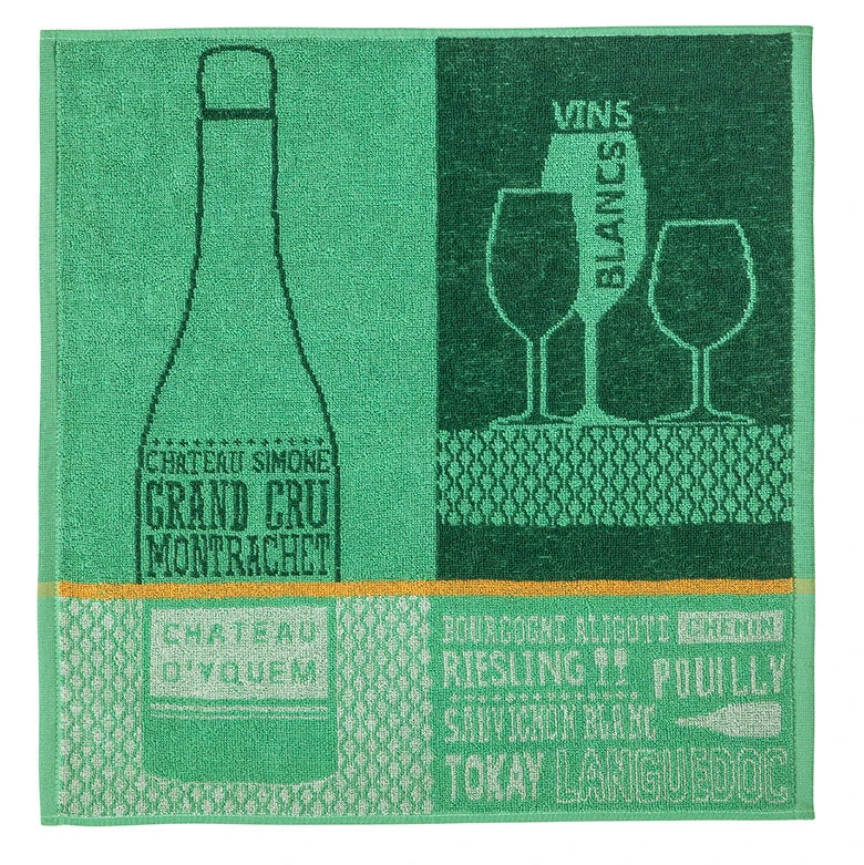 From Coucke, a square terry towel for your kitchen, great for wiping down counters, drying dishes, and drying hands. Sauvignon, features a detailed illustration of wine bottles and glasses and names of famous white French wines on a green background. The design is woven into the towel, not printed on top, for lasting durability.