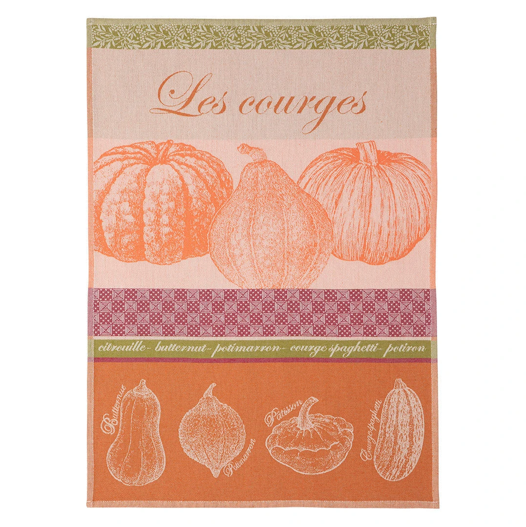 The Squash (Courges) jacquard dish towel from Coucke will brighten your kitchen and your day. This orange towel measures 20″ x 30″ and features a detailed illustration woven into the towel of the fruits of various members of the gourd family. Beautiful and soft, this towel will serve you well.