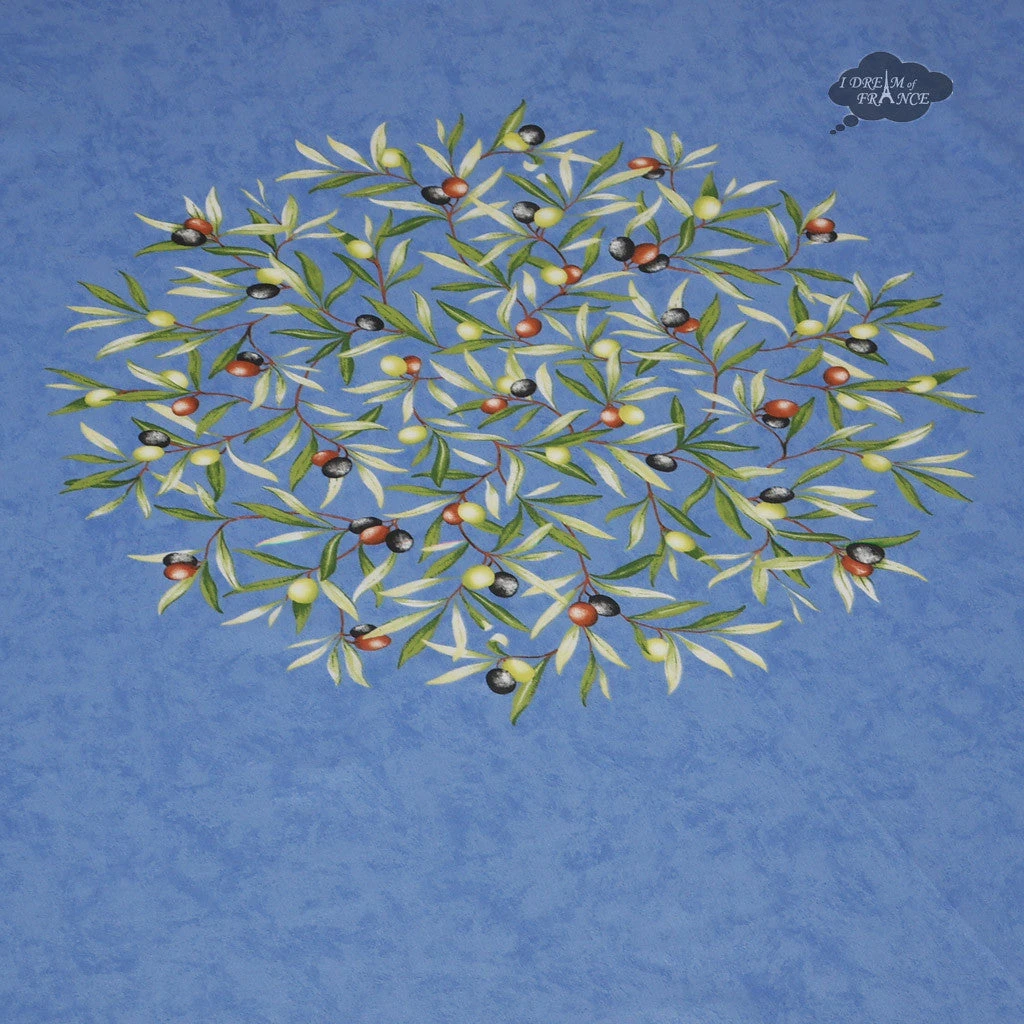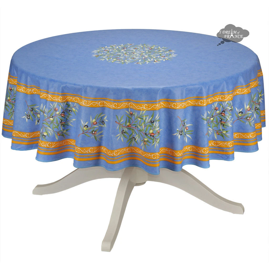 From Provence, this tablecloth features bright and cheerful olive branches on a blue background. It is 100% cotton and is available with or without stain resistant coating. With the optional acrylic coating, spills will not go through, protecting your table. Cleanup is as easy as wiping it with a sponge. UV resistant, they resist fading and are perfect inside or outside. This tablecloth measures 70″ in diameter, and will fit most round tables up to about 52 inches in diameter. It can be ordered with an umbrella hole; please see options below. Both coated and un-coated are machine washable and should be line dried. Made in France.