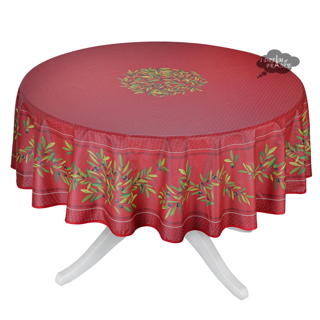 From Tissus Toselli, this coated tablecloth is named after the picturesque town of Nyons in the heart of Provence. It features a bright and cheerful olives motif on a dark red background with a woven cane rattan pattern. It is 100% cotton coated with acrylic to make it stain resistant and long lasting. Spills will not go through, protecting your table. Cleanup is as easy as wiping it with a sponge. UV resistant, they resist fading and are perfect inside or outside.
