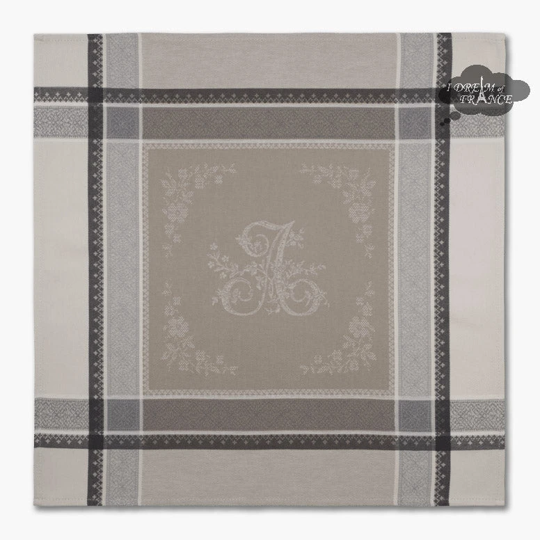 The Romantique table linens capture the color and spirit of French living. This napkin is yarn-dyed and damask-woven for beauty and durability. The beautiful Romantique Greige design depicts flowers and arabesques on a gray and “greige” background with black and white accents. This napkin is 20″ across. 100% cotton. Made in France.