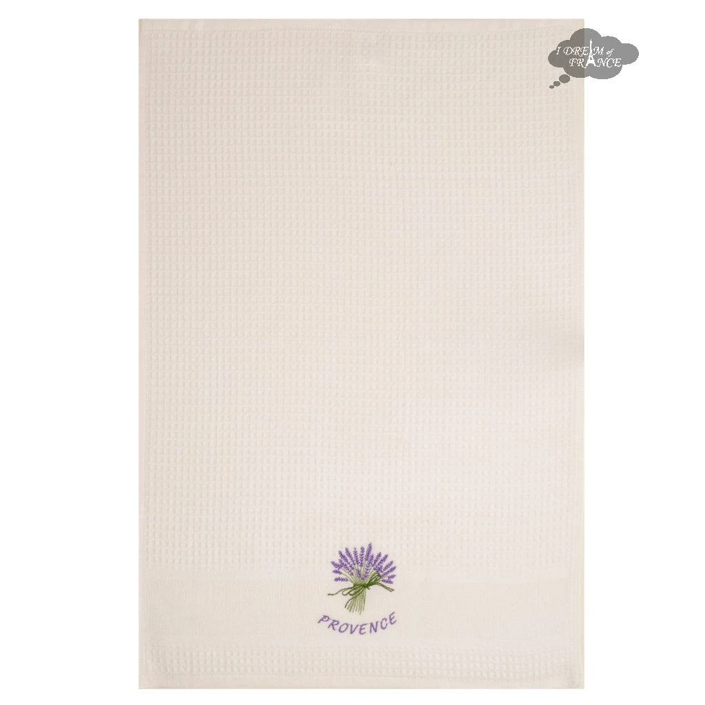 Direct from Provence, this beautiful towel will be a great addition to your kitchen. Made of 100% cotton, this towel will handle the toughest jobs thanks to its waffle-weave texture. This cream towel is embroidered with a bouquet of lavender and the word Provence. It comes rolled as on the picture, perfect for offering as a gift.