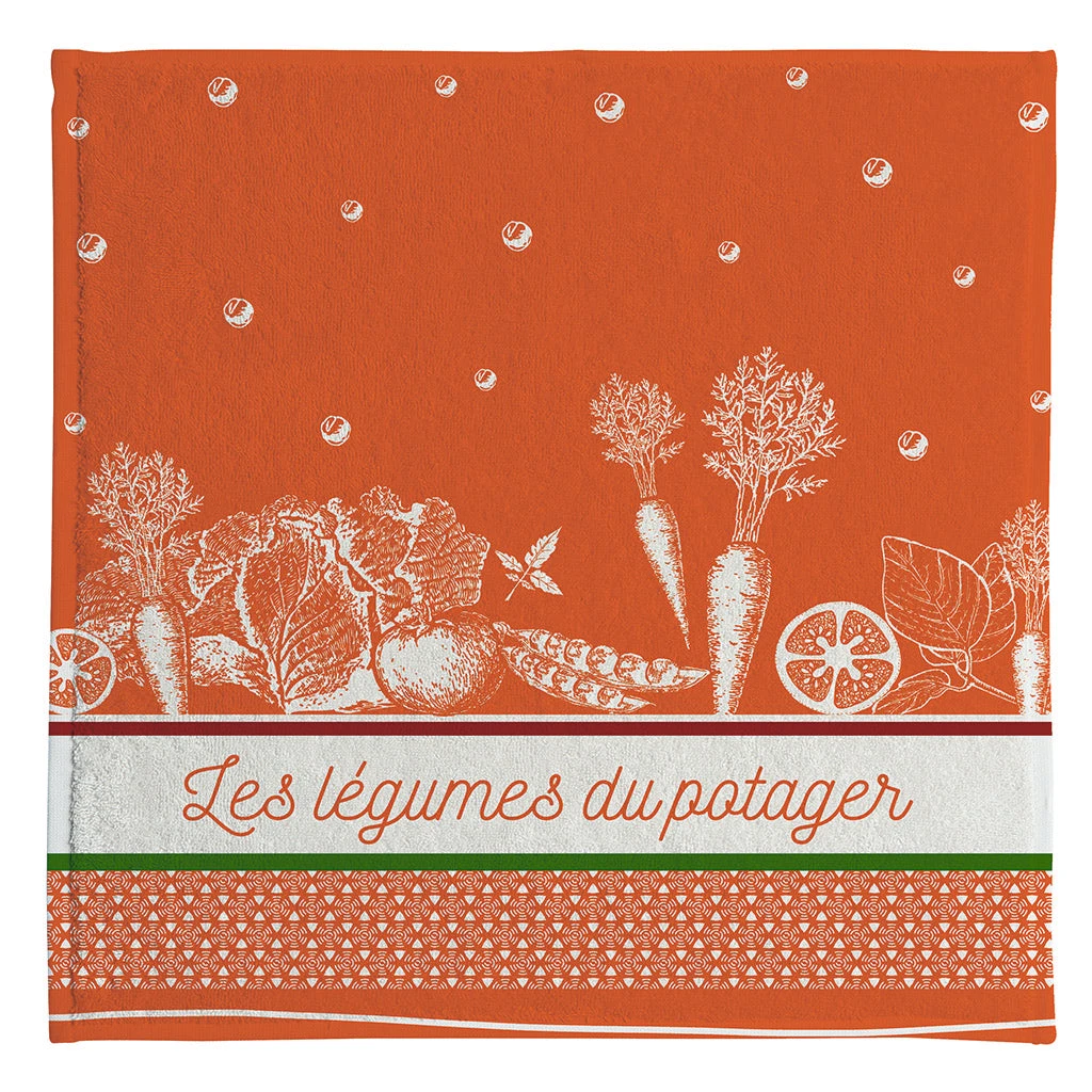 From Coucke, a square terry towel for your kitchen, great for wiping down counters, drying dishes, and drying hands. Legumes du Potager (Vegetables of the Garden), features a detail illustration of vegetables. The design is woven into the towel, not printed on top, for lasting durability.