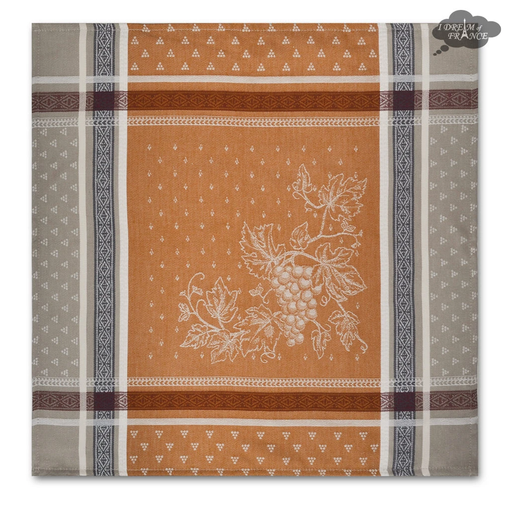 Here is a gorgeous napkin from Tissus Toselli suited for any winery or–your table! This napkin is yarn-dyed and damask-woven for beauty and durability. The beautiful Winery Caramel design depicts grapes on caramel, and taupe backgrounds. This napkin is 20″ across. 100% cotton. Made in France.